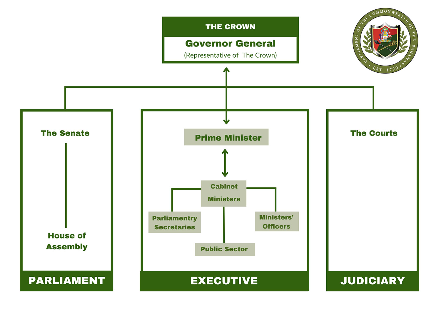 The Bahamas follows the Westminster Model of Governance, first developed by England. This system is bicameral (Consisting of two chambers) with an appointed Senate and an elected House of Assembly. His Majesty the King, represented by the Governor General, is also part of The Bahamas Parliament. Parliament is the forum where public policy and matters of national importance are debated.